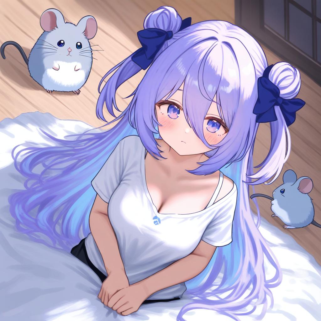 Amamiya shizuku (hizuki yayoi), original, 1girl, hair between eyes, blue eyes, purple eyes, purple hair, very long hair, blue hair, two side up, double bun, hair bow, medium breasts, collarbone, white shirt, blue bow, chinchilla (animal), animal, by artist roke (taikodon), animagine