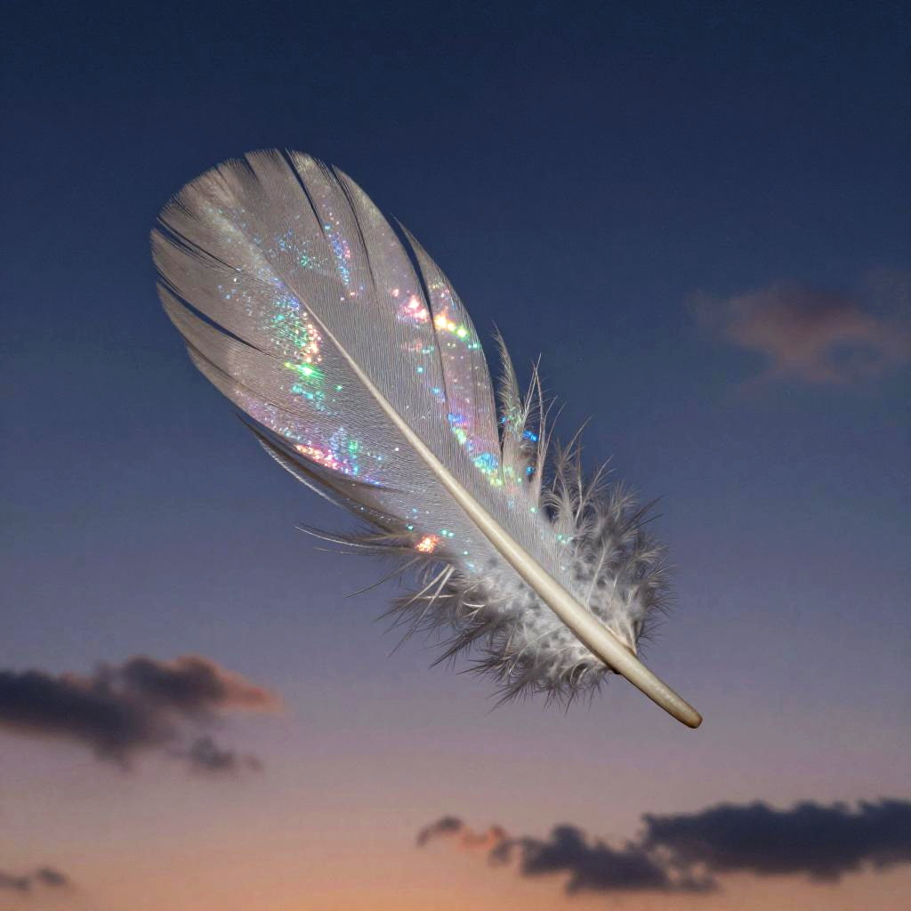 Aile d'ange detailed close-up, shimmering iridescent feathers with a celestial glow, floating against a twilight sky filled with stars and faint nebula clouds, mystical and elegant