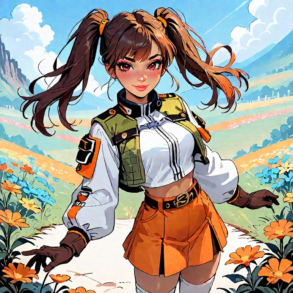 Score_9, score_8_up, source_7_up, source_anime, twintails, cropped jacket, orange and white jacket, green shoulder pad, tan shirt, orange skirt, belt, white thighhighs, brown gloves, looking at viewer, hill, field, flower, blue sky, looking at you, happy, standing, wide shot