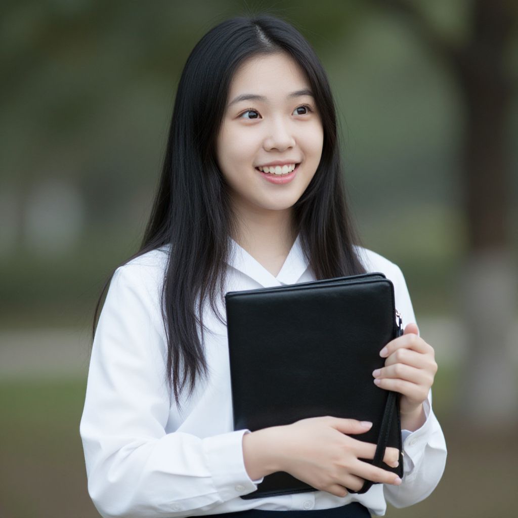 Photograph of an Asian woman with long, straight black hair, wearing a white long-sleeved shirt. She is smiling and holding a black tablet with both hands in front of her chest. The background is blurred, featuring green foliage and a brown tree trunk, suggesting an outdoor setting. Her skin is smooth and fair, and her makeup is minimal. The image has a soft, natural light, highlighting her friendly expression and the crispness of her white shirt.
