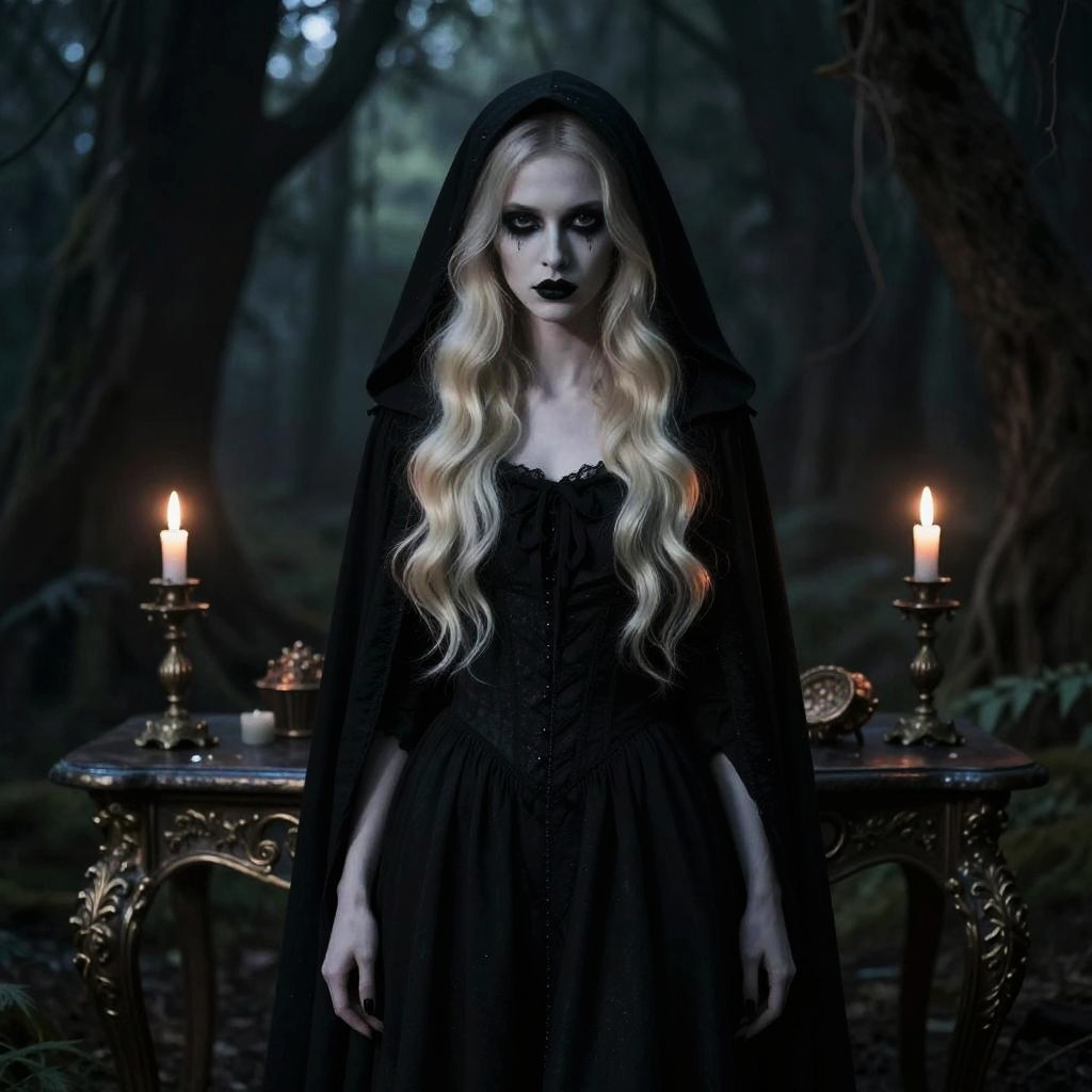 Photograph of a pale, Gothic-style woman with long, wavy, platinum blonde hair, standing in a dark, dense forest. She wears a black, lace-trimmed dress and a matching black veil that covers her head. Her makeup is dramatic, with dark, smoky eyes and black lipstick. Flanking her are two ornate, gold candelabras with lit candles, casting a soft, eerie glow. An antique, silver tray with a small, ornate box sits on a round table behind her. The background is filled with shadowy, tall trees, adding to the mysterious and haunting atmosphere.