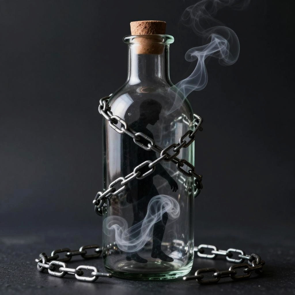 Symbol for addiction, surreal image of a human silhouette trapped inside a glass bottle with swirling smoke and chains, dark muted tones, emotional and thought-provoking concept art