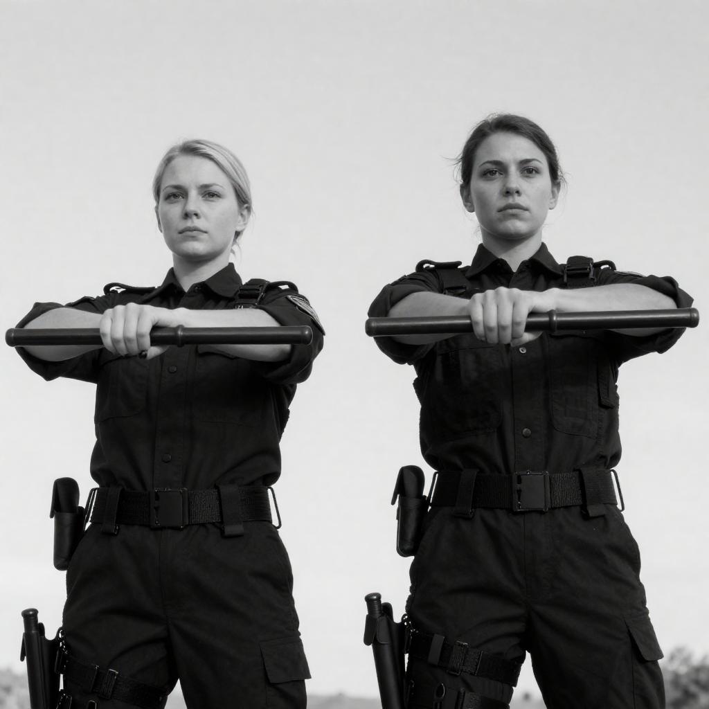Black-and-white photograph of two women in tactical gear, standing side by side with arms extended, holding batons. Both have short hair; the woman on the left has blonde hair, while the woman on the right has dark hair. They wear dark uniforms with belts and pouches. The background is a bright, overexposed sky.