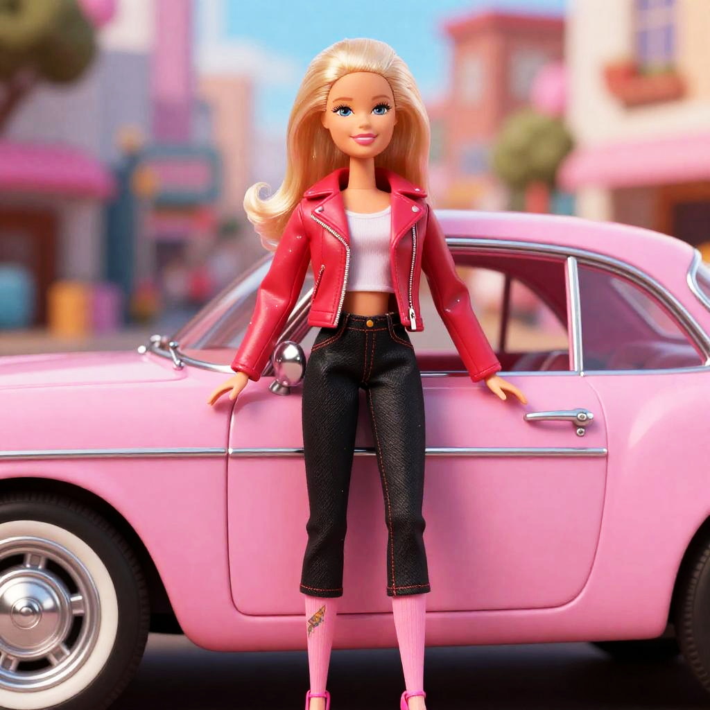 (masterpiece, best quality), highres, (8k, RAW photo, highest quality), ultra-realistic, 3d, centered, (TS_Barbie), mid shot, (full body:1.2), beautiful, a blonde barbie girl leaning against a pink vintage car in a red leather jacket with black jeans in the style of pixar, (legwarms), pink heels, pink stockings, stockings, tattoo, (perfect lighting and composition:1), soft lighting, (high detail, 8K resolution:1), hdr:0.7, detailed face, perfect, (dynamic), pose, (high quality:1.2), plastic skin, ((shiny:1.3)), hourglass figure, smile, (depth of field:0.8), 50mm, film grain:0.7, fujifilmXT3, focus face, looking at viewer, (detailed eyes), floating particles, analog style, light makeup, lipstick, (thick waist, thick arms, thick thighs:0.6), urban cityscape, amazing composition, lively, ((volumetric lighting)), halation:0.5