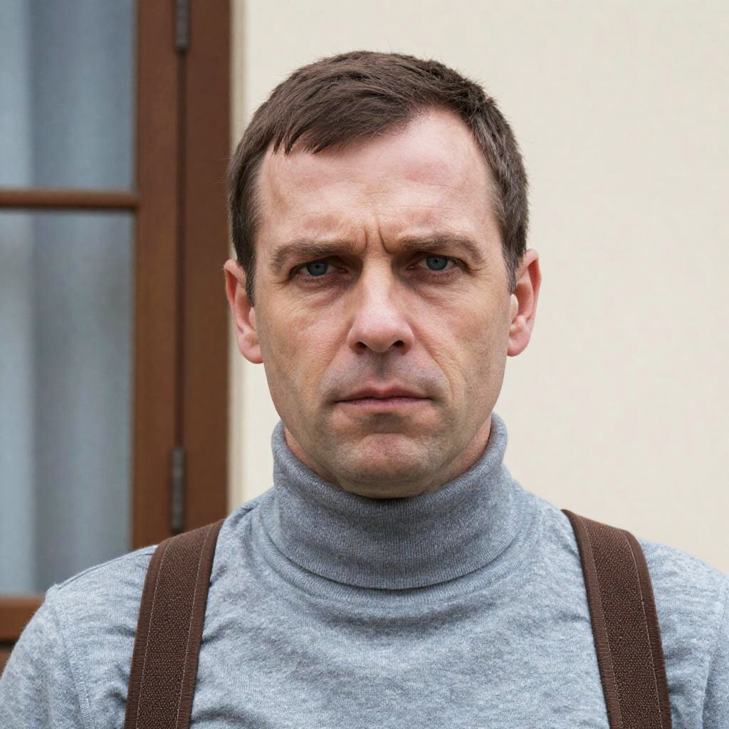 Photograph of a middle-aged man with pale skin, blue eyes, and dark brown hair with a slight receding hairline. He wears a dark brown, double-breasted coat with a high collar and a brown, patterned scarf. Background features blurred, tiled walls. The man's expression is serious, looking directly at the camera.