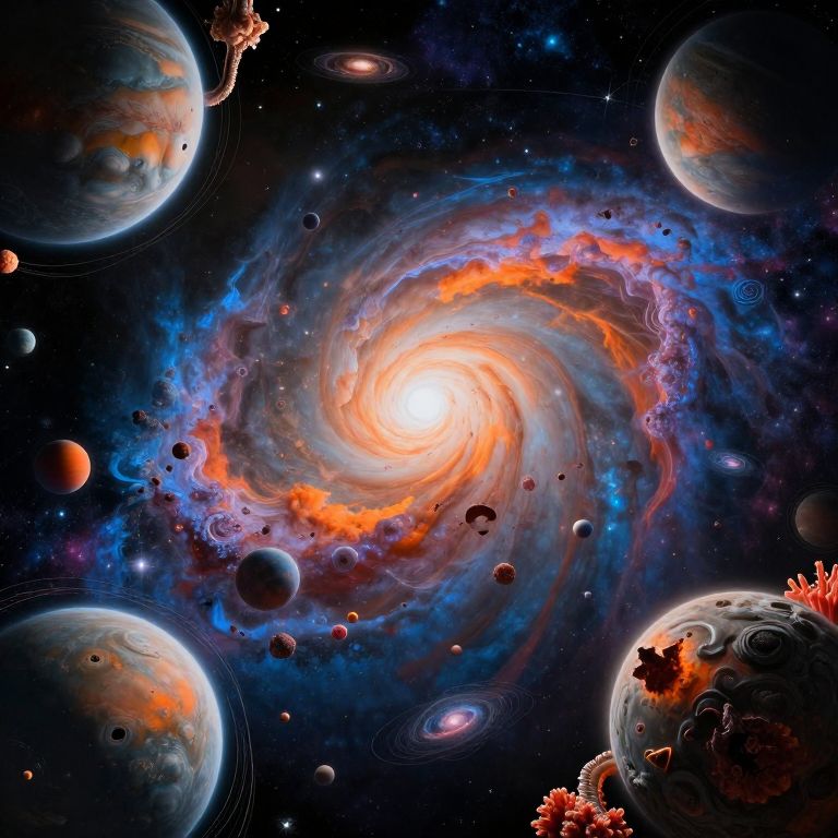 Digital CGI of a vibrant, swirling galaxy at the center of a starry, cosmic space, surrounded by various planets and celestial bodies. Bright orange and