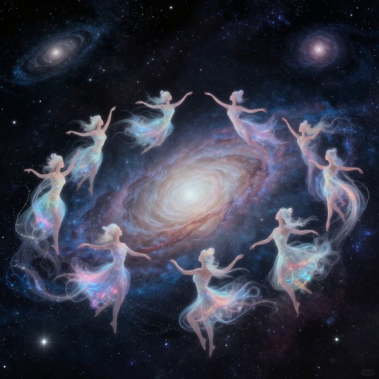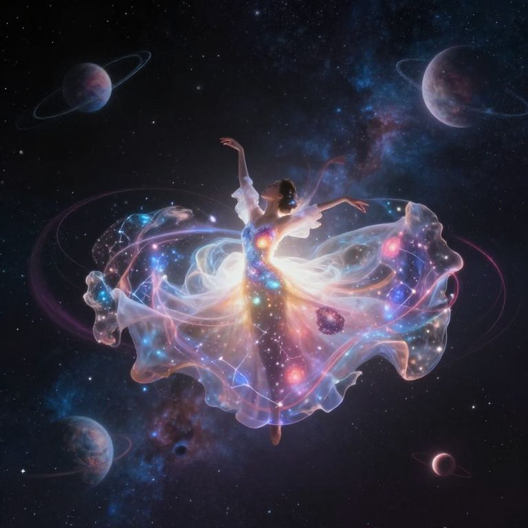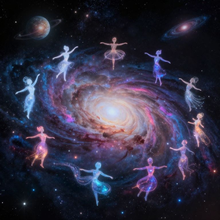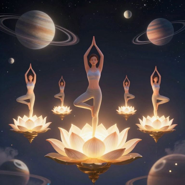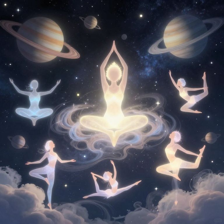 Amidst a celestial ballet of planets and ethereal clouds, otherworldly beings find serenity in gravity-defying yoga poses, their luminous forms radiating inner peace and cosmic harmony.
