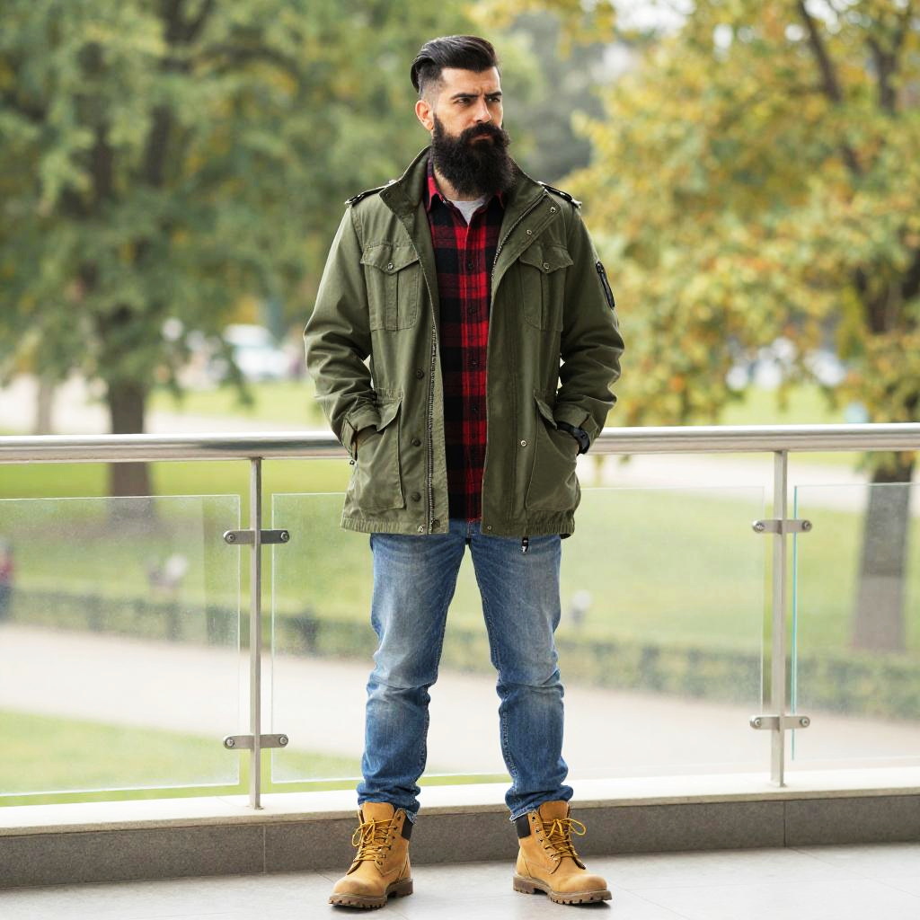 Photograph of a bearded man with a thick black beard and neatly styled hair, standing on a balcony. He's wearing a green military-style jacket, red and black plaid shirt, blue jeans, and tan lace-up boots. His hands are in his jacket pockets. The background shows a blurred green park with trees. He looks off to the side with a serious expression.