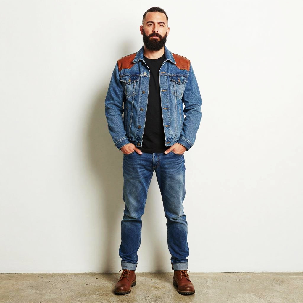 Photograph of a bearded man with a thick black beard, wearing a green military jacket, red plaid shirt, blue jeans, and tan work