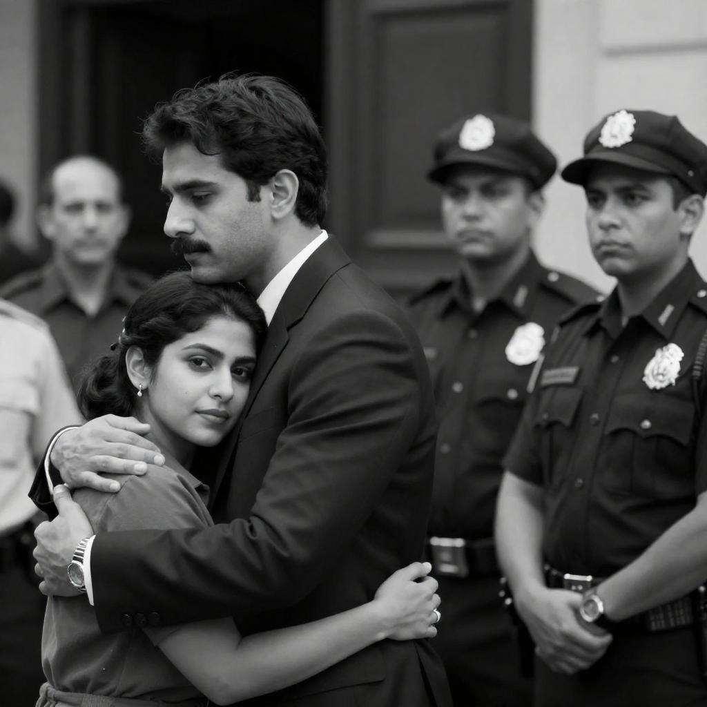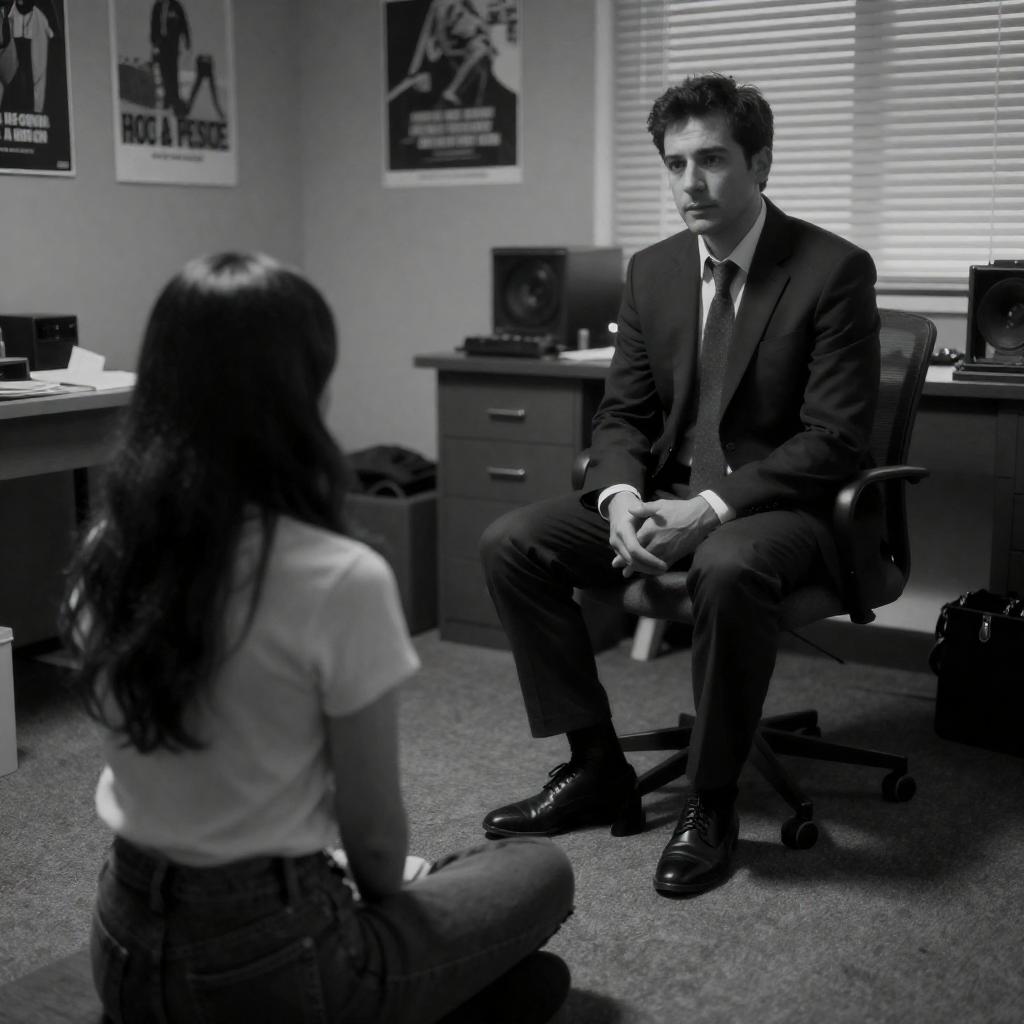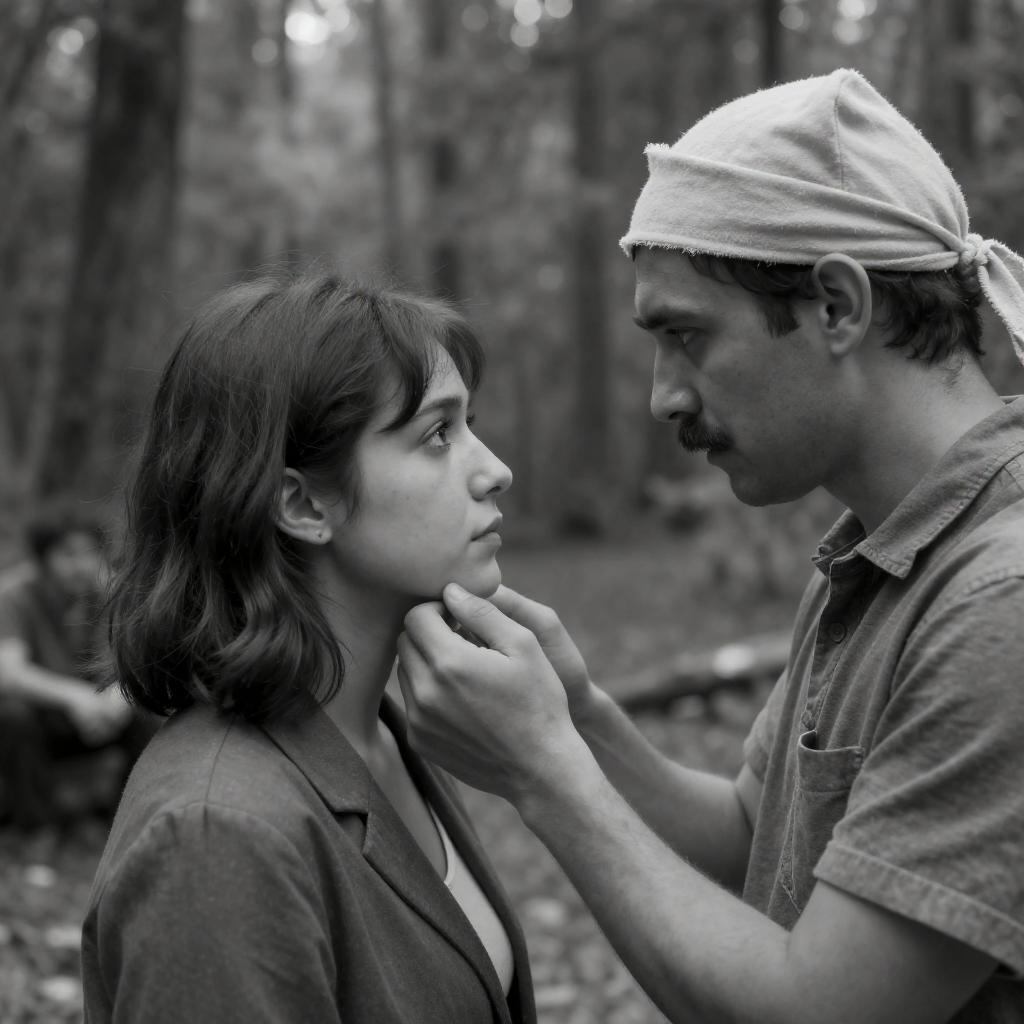 Black-and-white photograph of a tense scene: a man in a dark shirt leans over a seated woman in a police uniform, both looking intently at each other. Background includes a fan, wall posters, and shelves. The man's posture is dominant, while the woman's relaxed yet attentive posture contrasts.