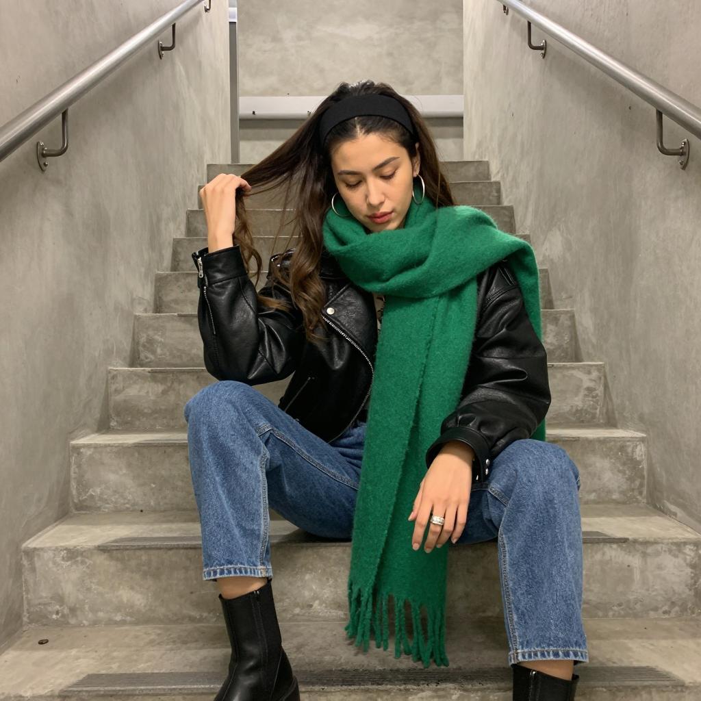Asian woman with dark hair in a high ponytail, wearing sunglasses, beige fuzzy coat, green pants with pink stripe, black Converse sneakers with "CONVERSE" in white, sitting on a metal grate against a gray wall, left hand resting on face, legs spread.