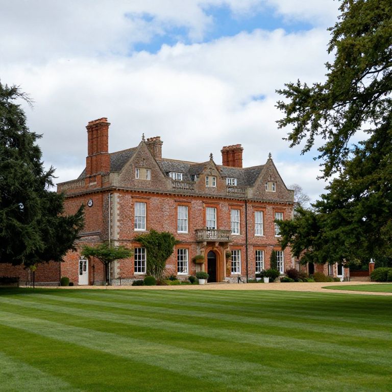 Bradley House, nestled in the Wiltshire countryside, stands as a grand brick mansion with three prominent chimneys, surrounded by lush green lawns and framed by mature trees under a partly cloudy sky.