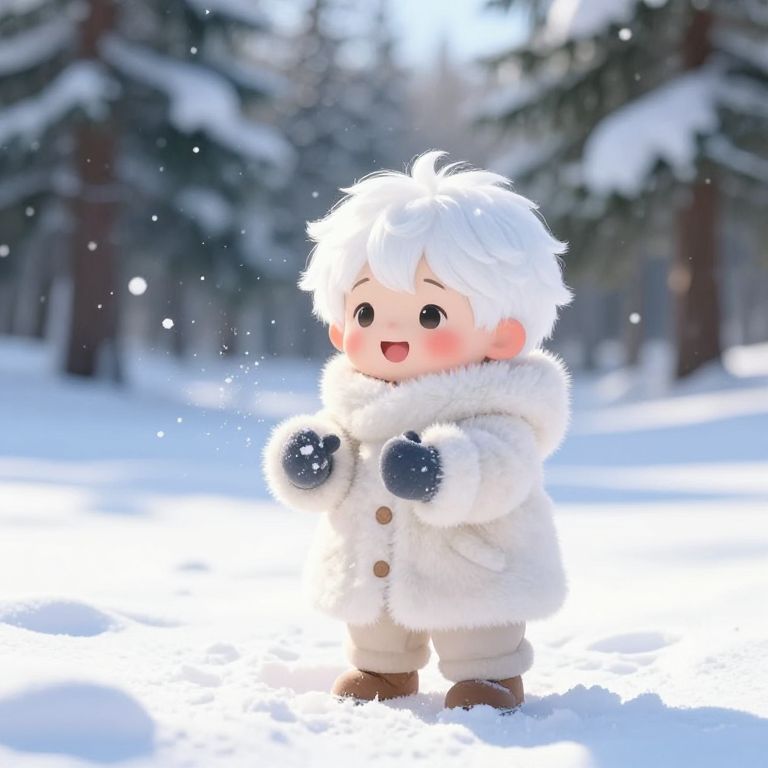 Cute white hair boy playing in a snowy landscape, bundled in a fluffy coat and mittens, snowflakes falling gently around him, rosy cheeks and joyful smile, detailed winter forest in the background with pine trees and soft sunlight casting long shadows, heartwarming and magical vibe.