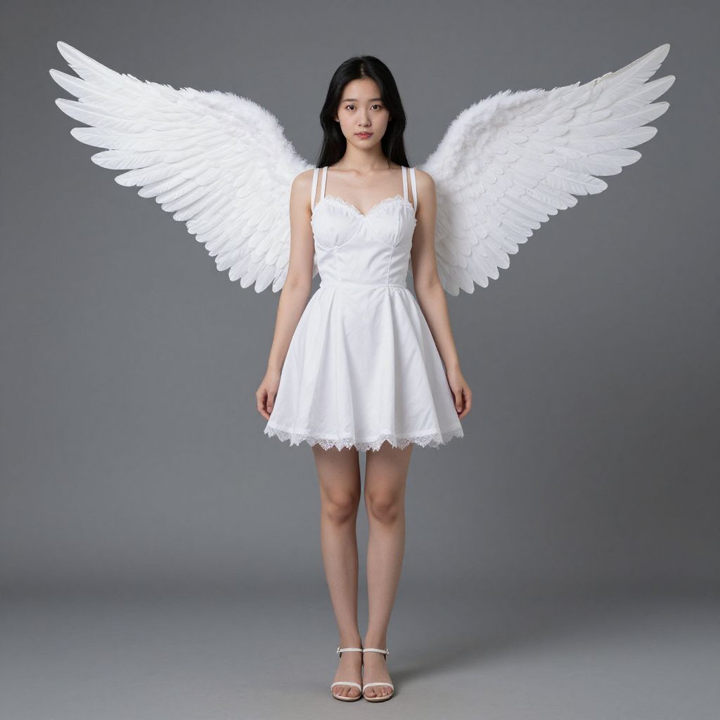 White angel dress costume, solo, wings, dress, 1girl, realistic, black hair, angel wings, white dress, sandals, asian, standing, angel, full body