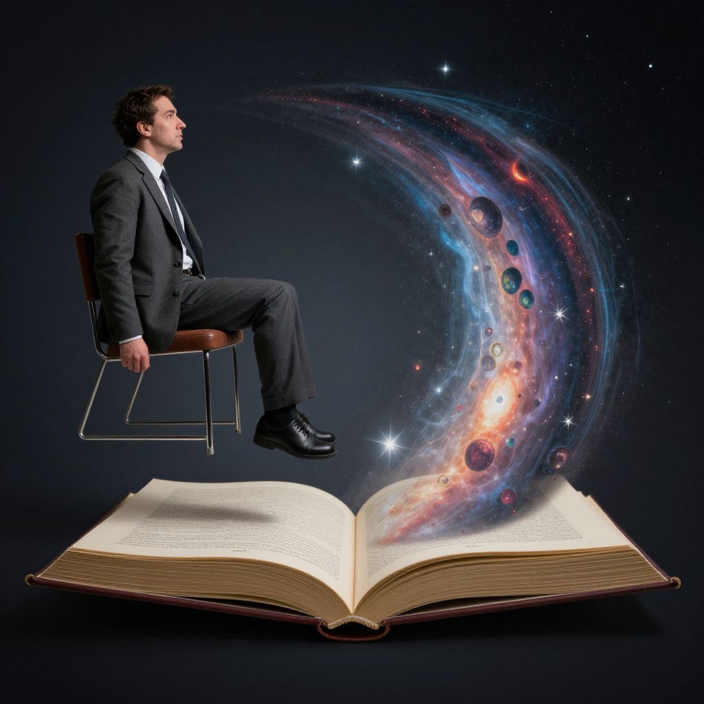 A surreal digital artwork captures a man suspended above his chair as he gazes in wonder at an open book revealing an expansive, swirling cosmos within its pages. The scene embodies a mysterious atmosphere, merging elements of science fiction and fantasy to explore human curiosity and imagination, reminiscent of Dali-esque melting clocks without directly referencing them.