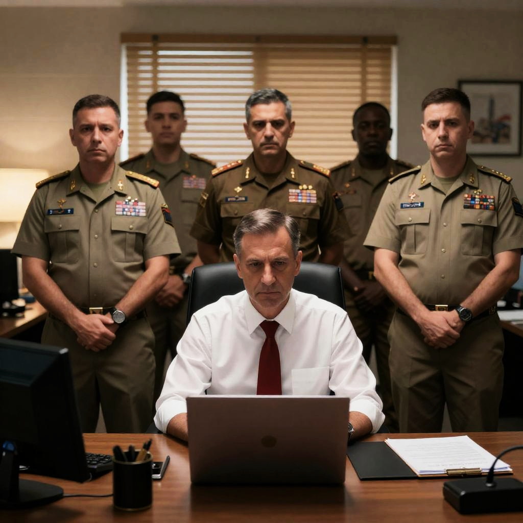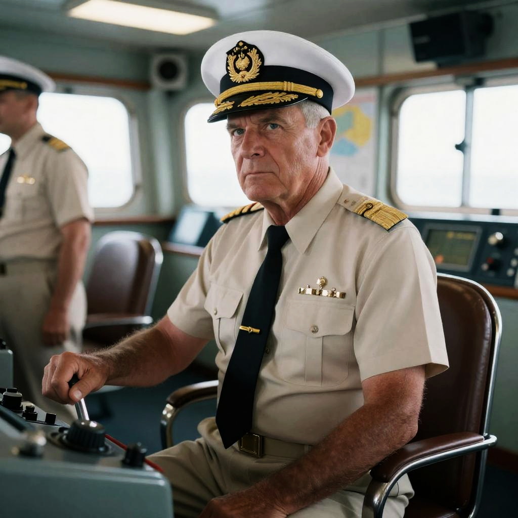 Photograph of two men in a wooden room. One man, seated, bald, wearing a dark military-style uniform with medals, looking forward. The other man, standing, dark-haired, in a black naval uniform with gold trim, looking slightly to the side. American flag in background.