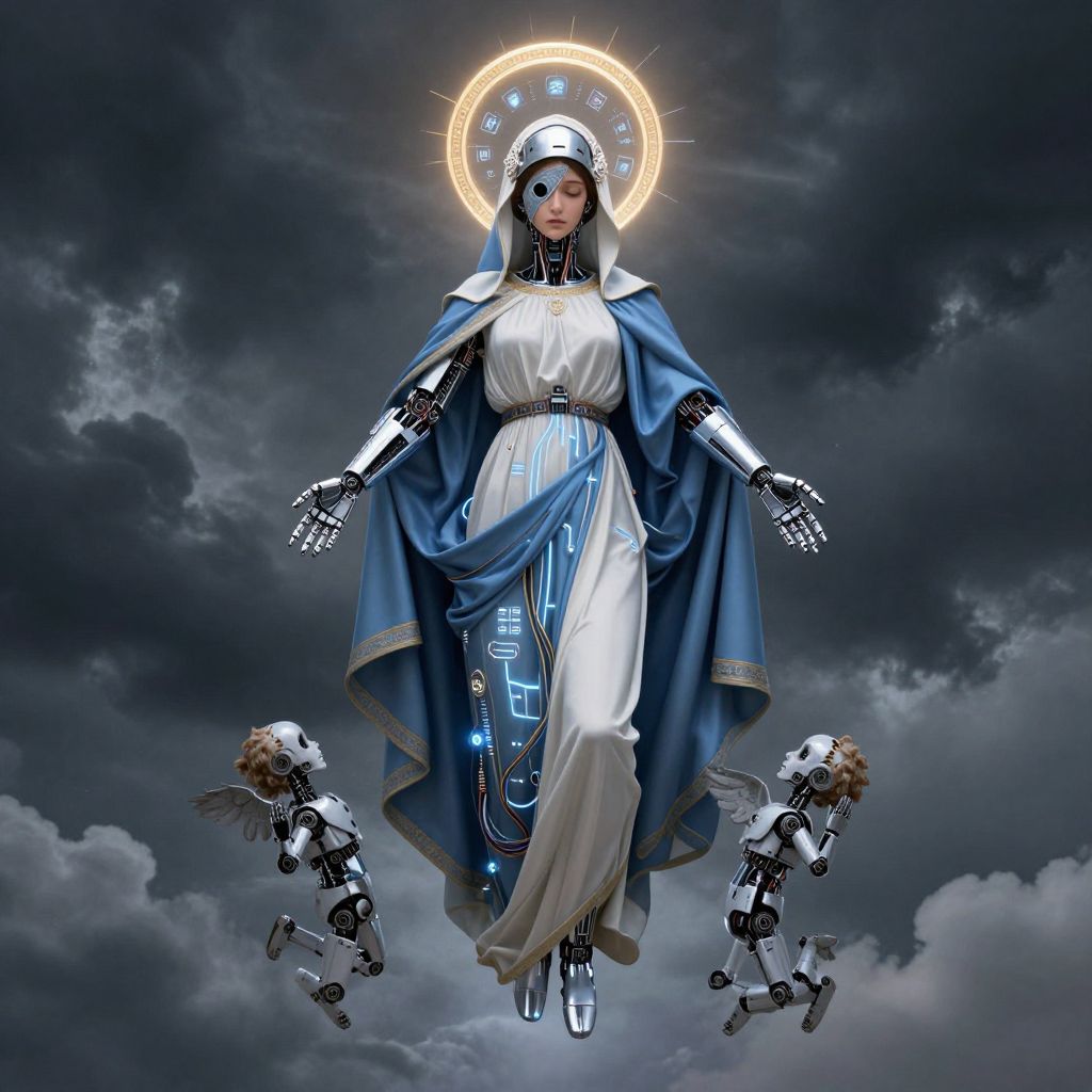 Digital illustration of a cybernetic Virgin Mary with glowing halo, surrounded by two robotic angels, against a dark, cloudy sky.