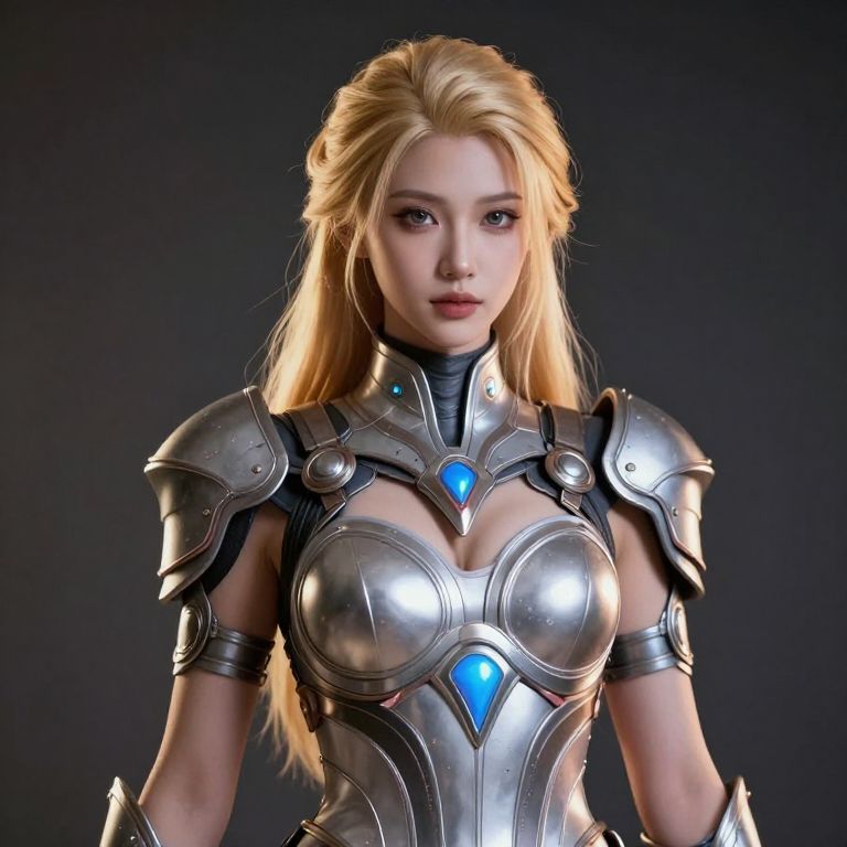 Photorealistic CGI portrait of a young, fair-skinned blonde woman with long, straight hair, wearing detailed, silver metallic armor with blue gem accents on her chest and shoulders. Her armor has a futuristic design with a high collar and segmented shoulder plates. She has a serious, focused expression with subtle makeup, and the dark, gradient background contrasts with her bright armor. The image emphasizes the shiny texture of the metal and the softness of her hair, creating a striking, epic fantasy warrior aesthetic.