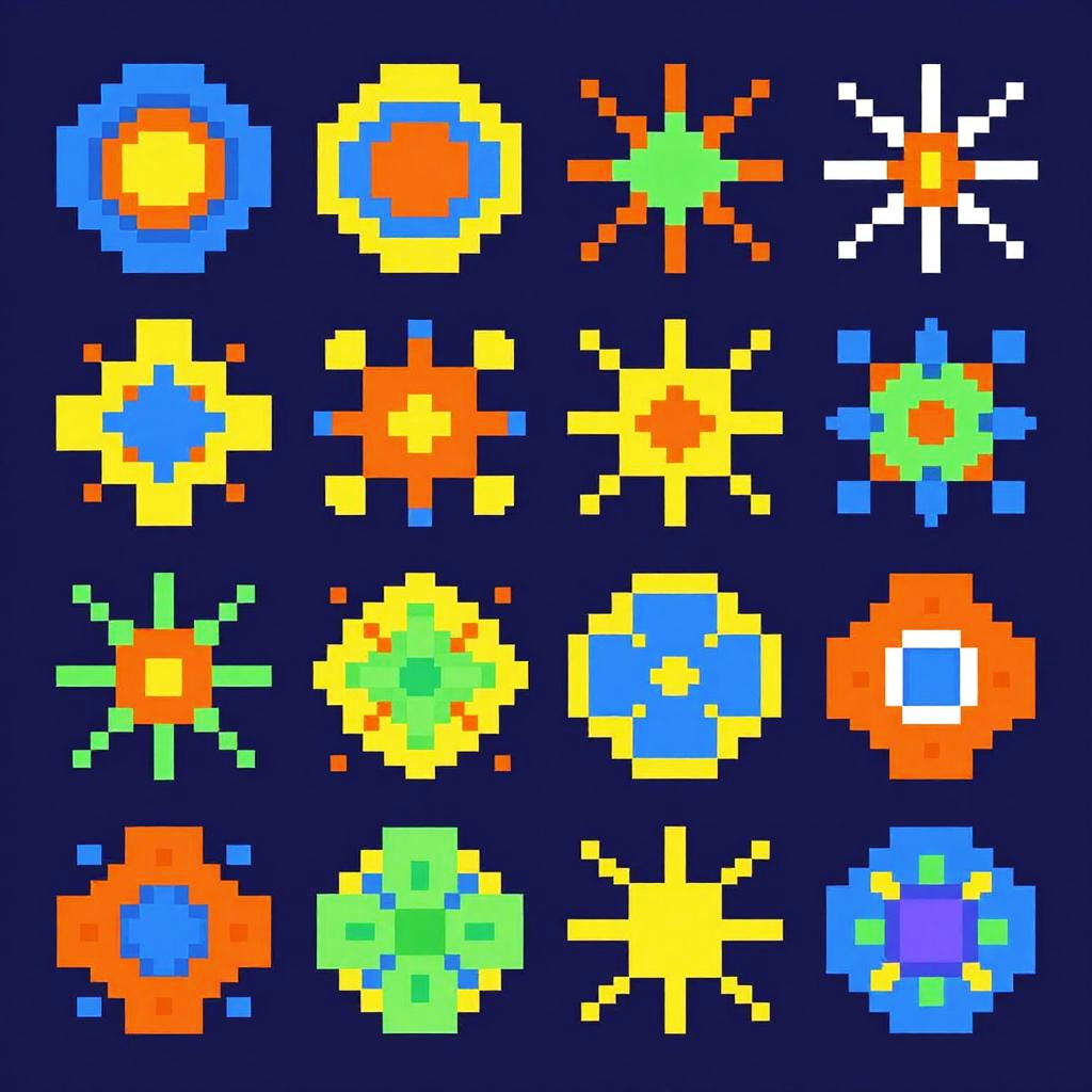 This is a digital pixel art image featuring four rows of colorful, abstract, pixelated artwork. Each row showcases a unique, vibrant, and geometric composition, using bright colors like blue, orange, yellow, and green. The top row has circular and star-like shapes, while the bottom row includes more organic forms and a robotic figure. The overall style is retro video game-inspired with a neon, 8-bit aesthetic.