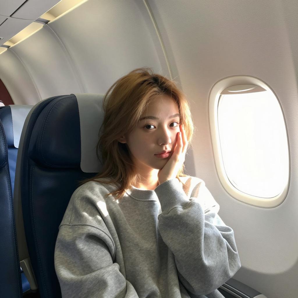 Photograph of a young woman with light brown skin and blonde hair, sitting in an airplane seat. She wears a light gray hoodie and holds a brown patterned backpack on her lap. She has closed eyes and a neutral expression. An airplane window shows an airport exterior. She sits against the window on the right side, with the airplane seatbelt visible on the left.