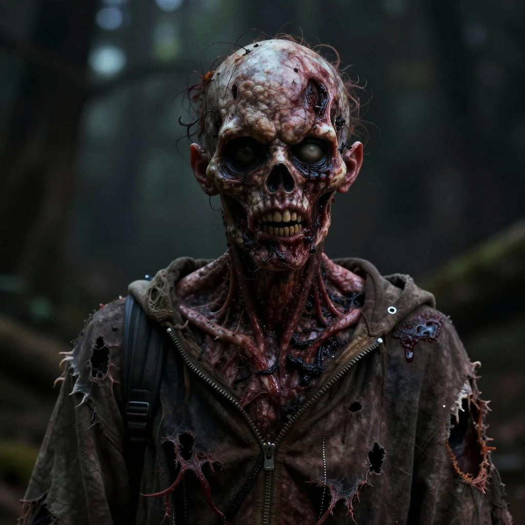 Photorealistic digital artwork of a terrifying zombie with a decaying, blood-stained face, sunken black eyes, and a bald, skull-like head. The zombie's skin is marred with dark, bloody wounds and exposed muscle tissue. It wears a tattered, dark green hooded jacket with visible rips and a black backpack strap over one shoulder. The background is a dimly lit, dark forest, adding to the eerie atmosphere. The zombie's grimace reveals jagged, blood-stained teeth, enhancing its menacing appearance. The overall color palette is dark with predominant shades of brown, black, and red.