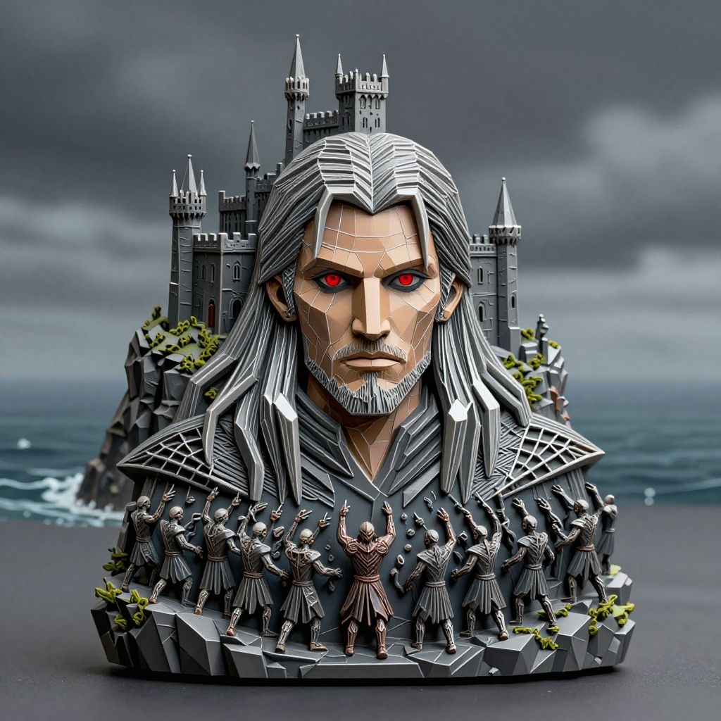 This digital art piece features a stern, gray-bearded man with long, silver hair and glowing red eyes, centered against a dark, stormy sky and ocean backdrop. He wears a detailed, metallic armor with intricate patterns, and a large castle with multiple towers rises behind him. In front of him, a miniature army of similarly armored figures stands in formation on rocky terrain. The scene is highly detailed, with a mix of realistic and fantasy elements, and a dark, moody color palette dominated by grays and blacks. The style combines elements of realism and fantasy, with a focus on dramatic lighting and detailed textures.