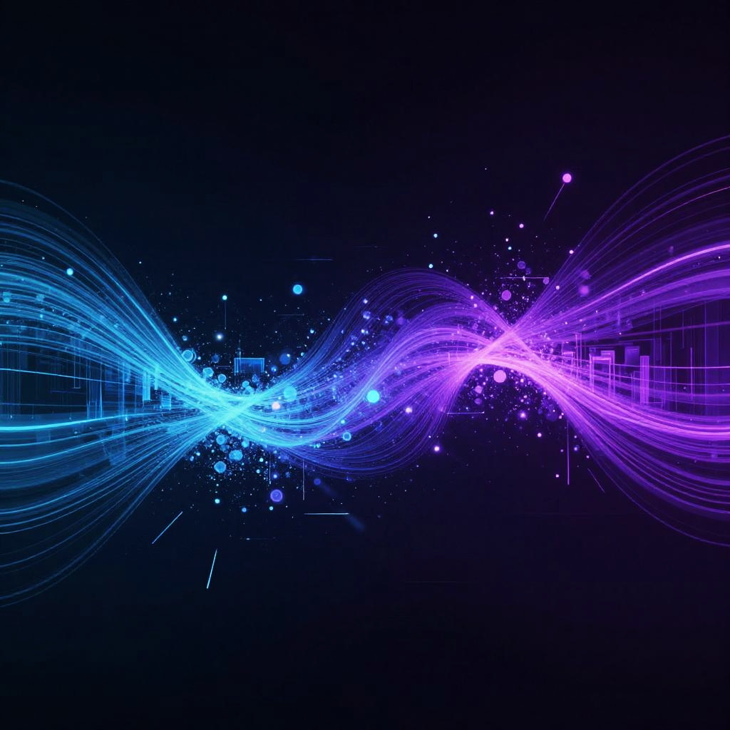 Abstract digital art representing data transmission, vibrant streams of light and particles flowing through a dark space, neon colors with blue and purple dominance, dynamic motion effect, technological theme, glitch art elements