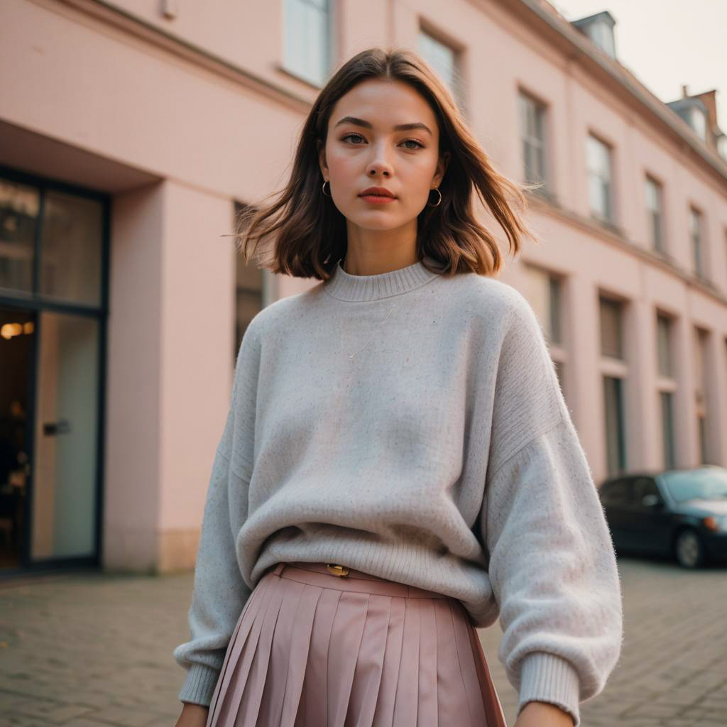Portrait of a confident young woman wearing a soft, oversized light gray sweater paired with a pastel pink pleated skirt. She has shoulder-length brown hair, hoop earrings, and stands outdoors in an urban setting with soft natural lighting and a dreamy, soft-focus effect.