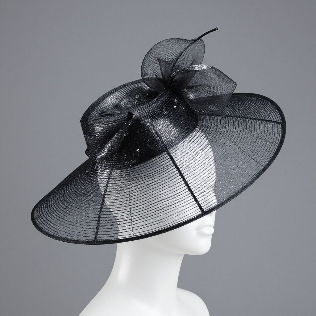 Photograph of a white, faceless mannequin head wearing a large, black, sheer, wide-brimmed hat adorned with a silver ribbon bow. The hat's delicate, mesh-like texture contrasts with the mannequin's smooth, featureless surface. The background is a solid, muted gray, highlighting the hat's intricate details. The mannequin's bare shoulders are visible, and the hat is tilted slightly to the right, casting a soft shadow. The image emphasizes elegance and fashion, focusing on the hat's design and texture.