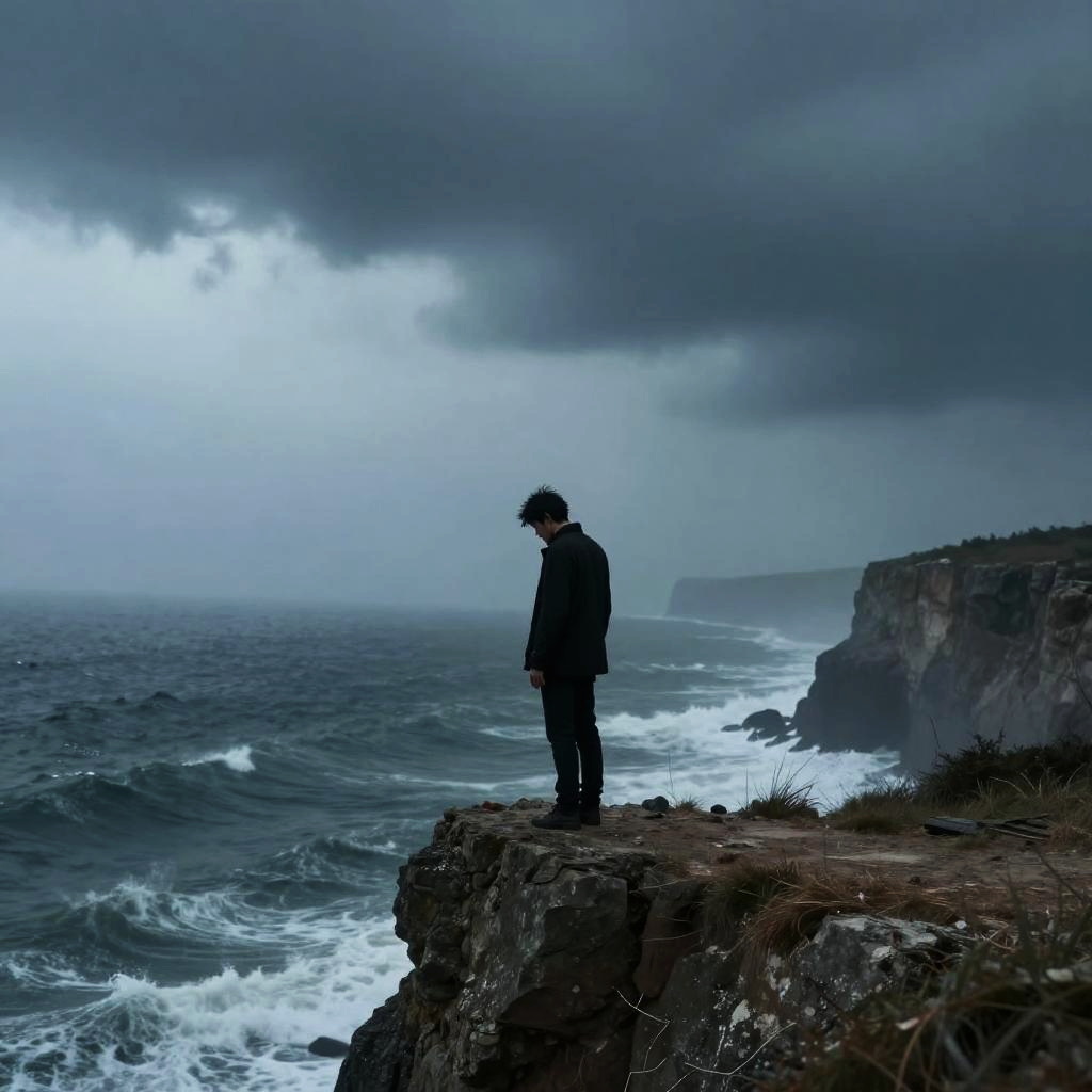 Sad man art, a silhouette of a man standing at the edge of a misty cliff overlooking a stormy sea, symbolizing isolation and despair, realistic style with cinematic lighting, cool color grading enhancing the sense of melancholy and loss.