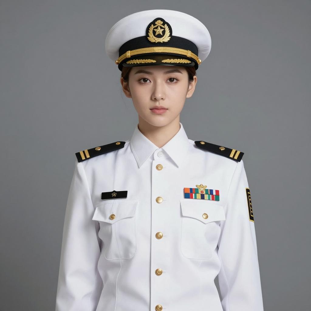 Photorealistic portrait of a young woman wearing a white naval dress uniform with gold buttons, black epaulets, and a white peaked cap with gold and black trim. The uniform features a black name tag on the left chest pocket and multiple colored ribbons on the right chest. She has brown hair tied back and wears a serious expression against a neutral gray background.