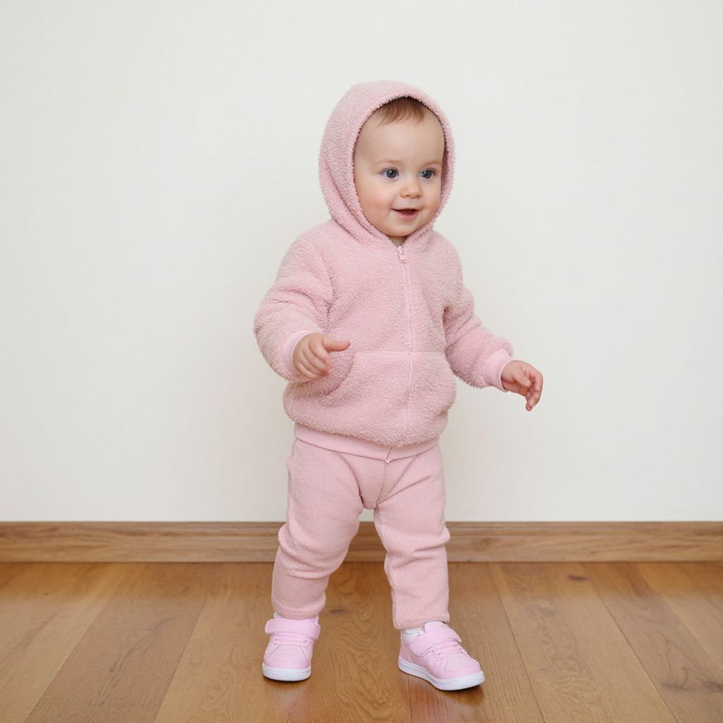 Photograph of a smiling baby with light skin, wearing a pink fleece hoodie, matching pants, and pink shoes, standing on wooden floor against a plain