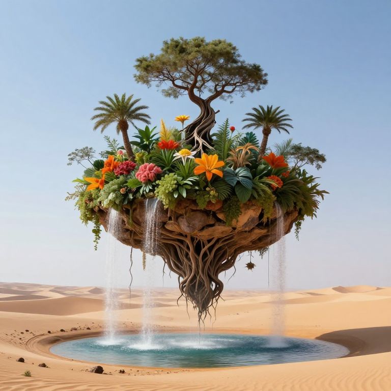 Suspended above a desolate desert, a vibrant island of life defies gravity, its roots reaching skyward in a surreal dance of resilience and hope, while cascading water mirrors the eternal cycle of renewal beneath a boundless expanse of serenity.