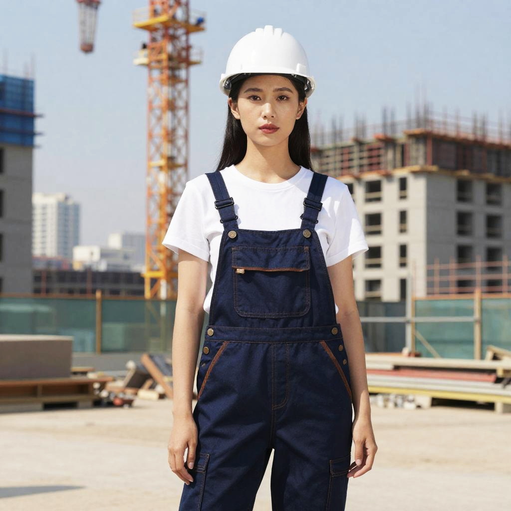Photograph of an Asian woman with long black hair, wearing a white helmet, white shirt, and blue overalls, standing in front of a construction