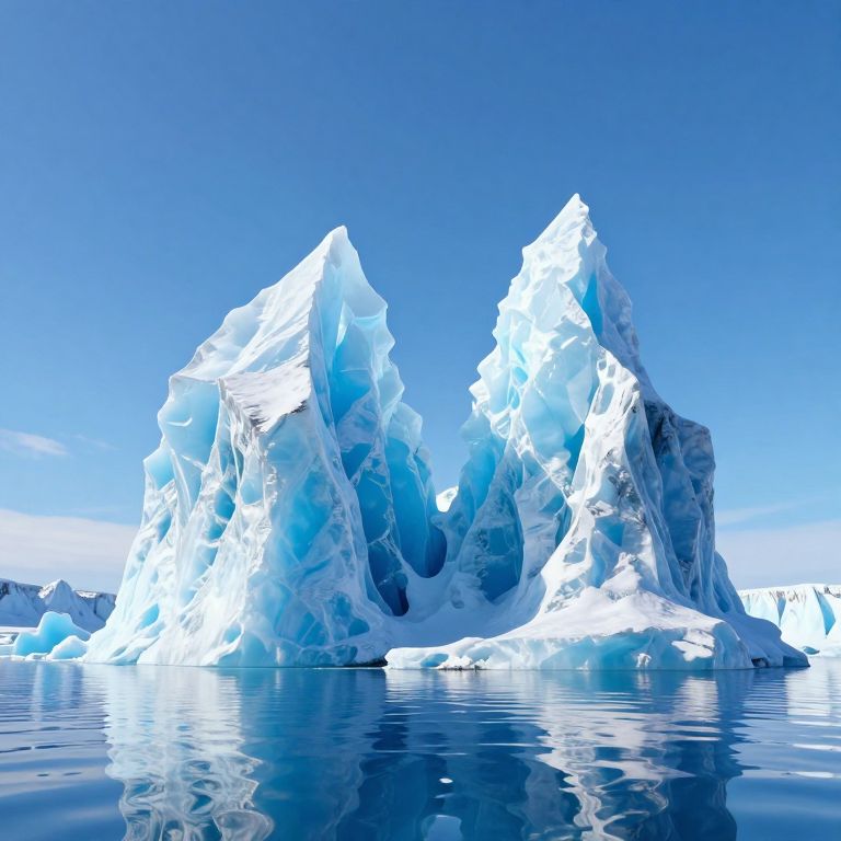 A serene 3D-rendered landscape captures two towering ice formations standing like sentinels against a clear blue sky, their translucent blue hues reflecting perfectly on the calm waters below, evoking a mirror-world where nature's elements are transformed into icy clarity.