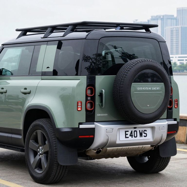 Sleek Land Rover Defender parked near a waterfront, featuring a matte green exterior, black roof rack, and license plate reading \"E40 WS,\" with a cityscape visible in the background.