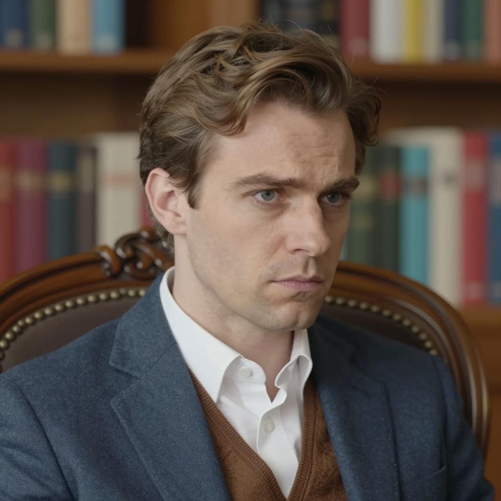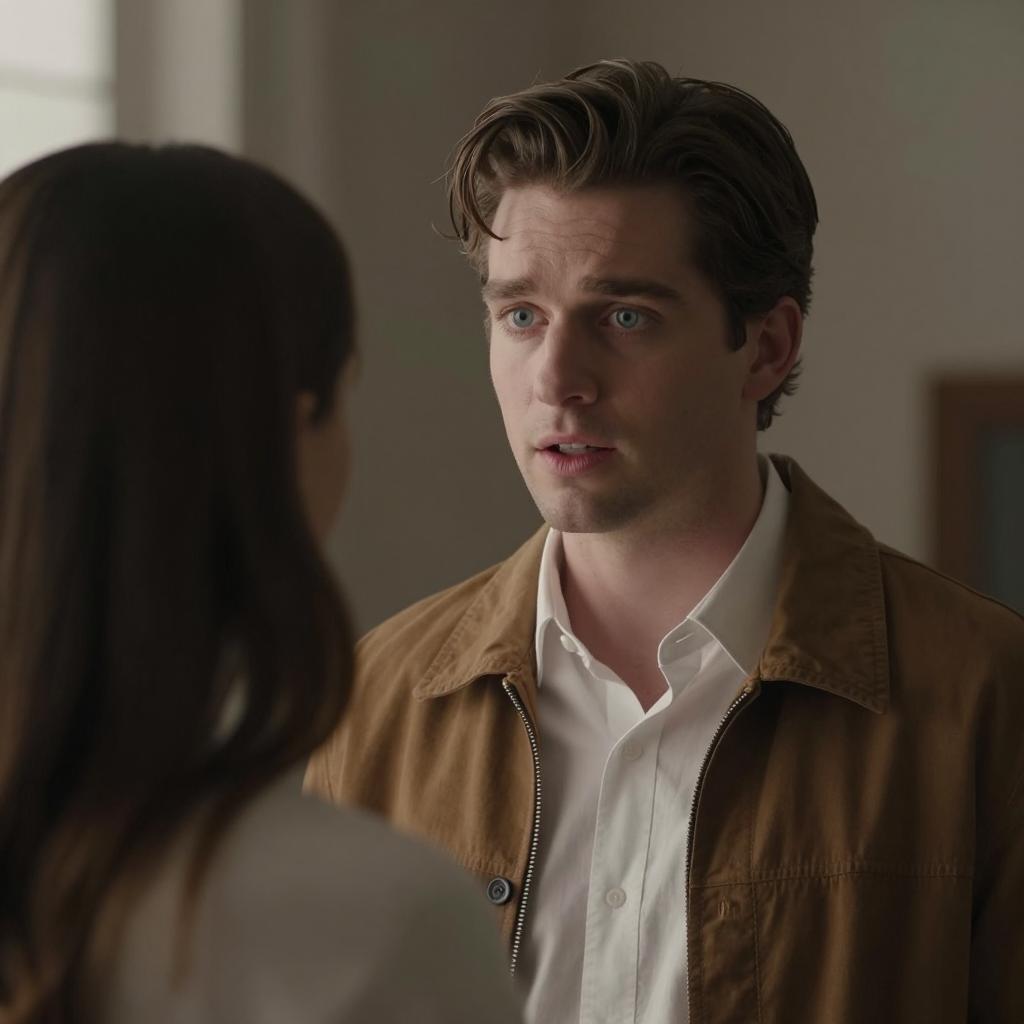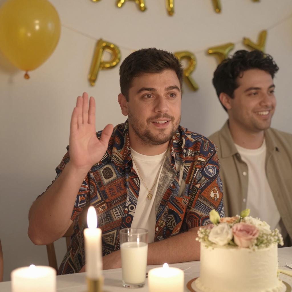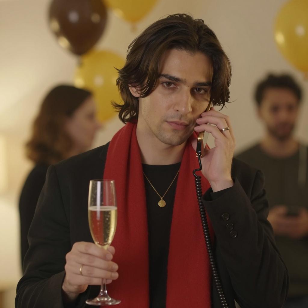 Man with medium-length dark hair, wearing a black jacket, red scarf, gold necklace, and ring, holds a champagne glass in his right hand and a gold phone to his mouth with his left hand. Background includes blurred balloons and warm yellow lighting. Man's expression is neutral. Coiled phone cord visible. Two more indistinct figures in the background.