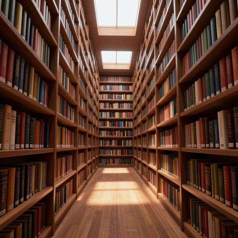 Photograph of a spacious, well-lit library aisle with tall, wooden bookshelves on both sides, filled with colorful, neatly arranged books. The shelves are uniformly spaced, creating a symmetrical view leading to a brightly lit ceiling skylight at the far end. The wooden floor is polished and reflects the light, enhancing the warm, inviting atmosphere. The books vary in size and color, adding a vibrant contrast to the rich brown wood of the shelves. The perspective draws the eye down the center, emphasizing the depth and orderliness of the library.