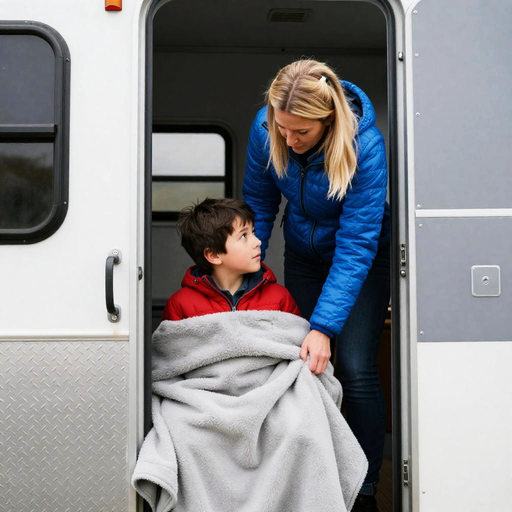Blonde woman in a blue quilted jacket leans down inside the open door of a silver travel trailer to help a young boy with dark hair wrapped in a gray blanket and wearing a red jacket. The boy looks up at the woman as she holds the blanket around him.