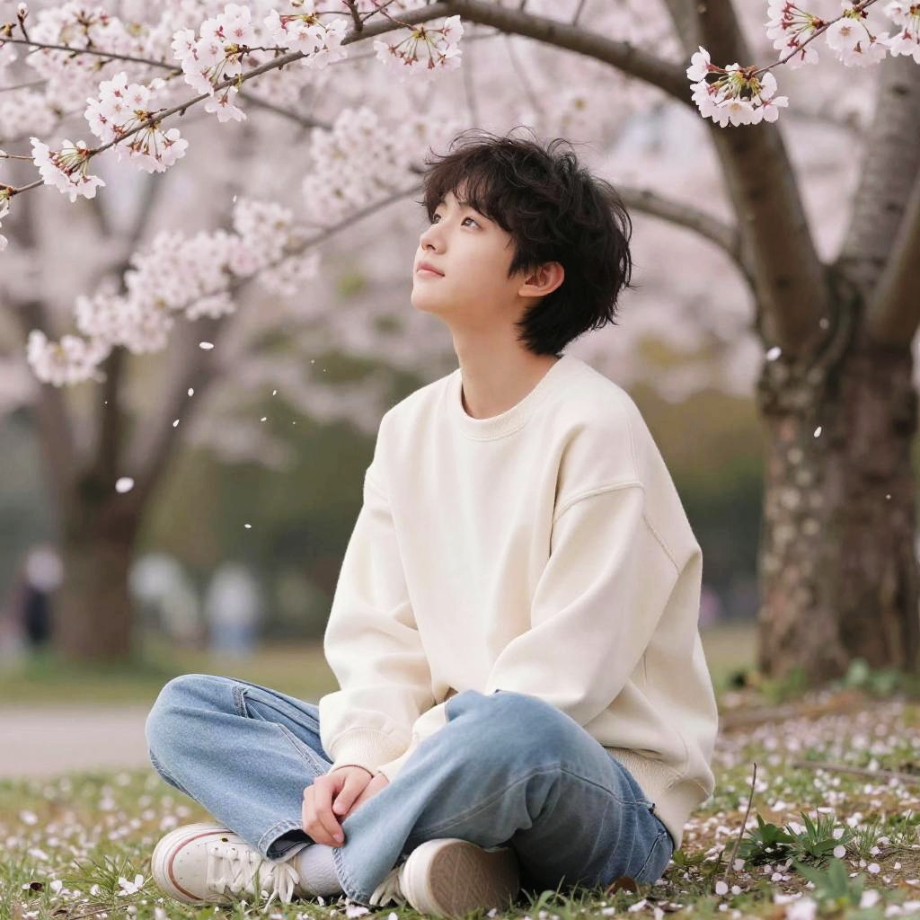 Attractive Korean man in traditional hanbok, serene expression, cherry blossoms in full bloom around him, soft pastel color palette, dreamy and peaceful atmosphere, artistic composition