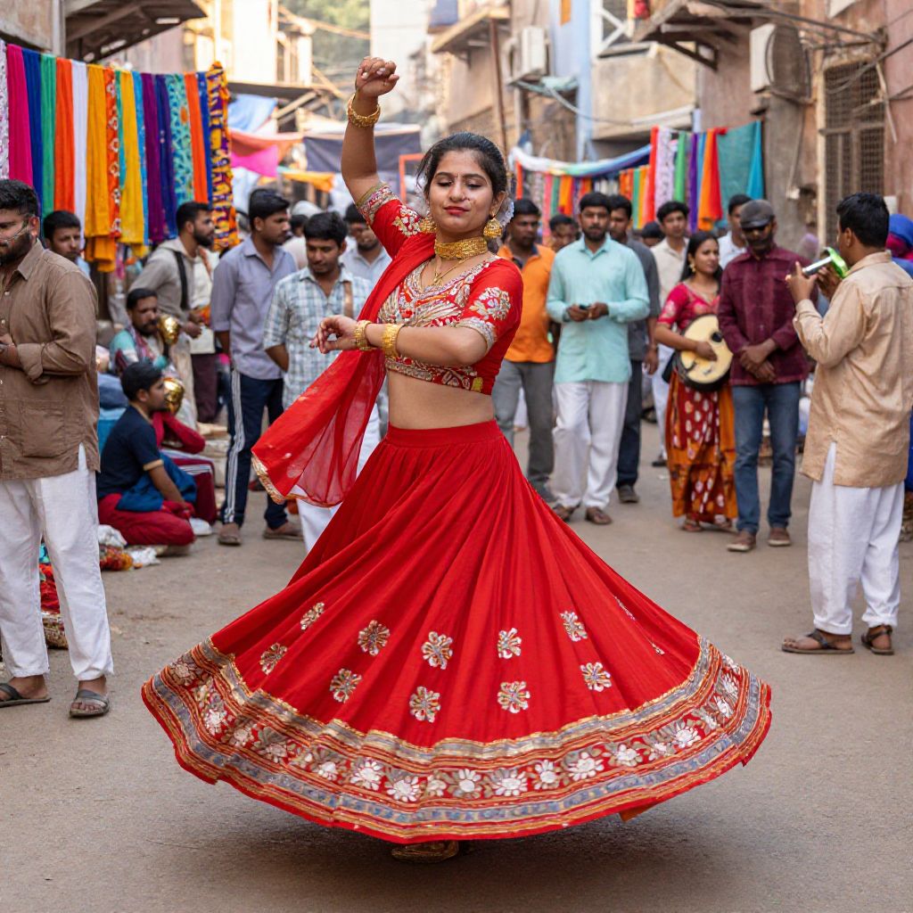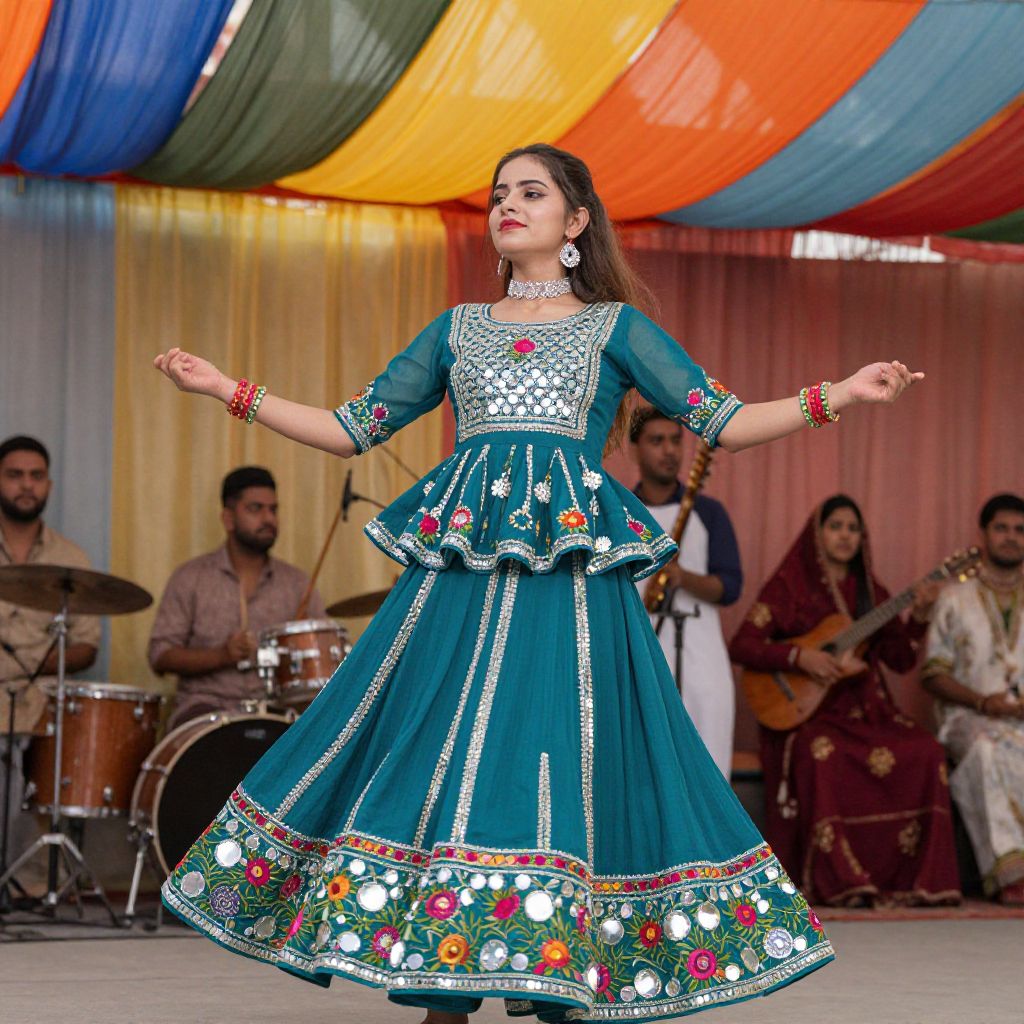 Punjabi dress styled with a bold peplum and mirror work, adorned with floral motifs, worn by a young woman dancing in a traditional music performance under a colorful canopy.