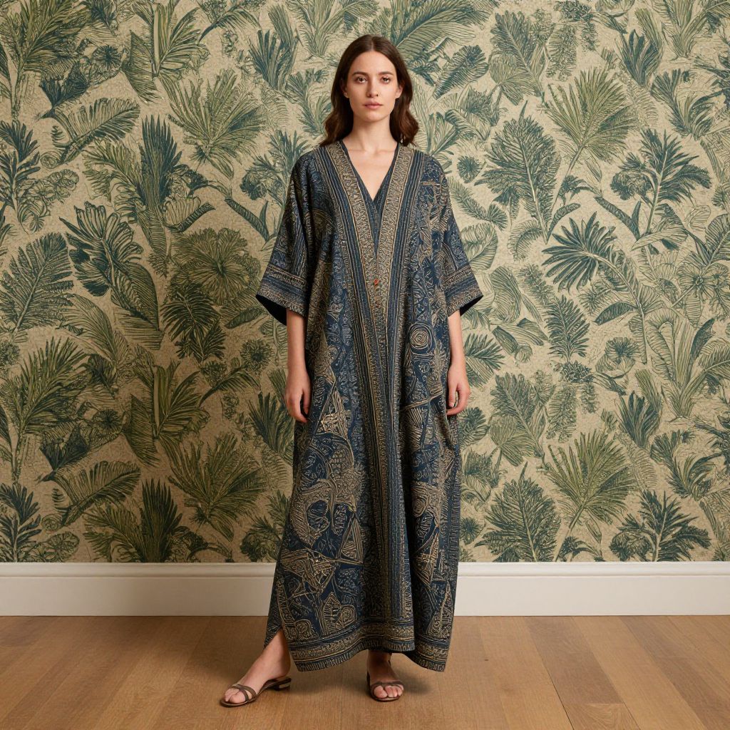 Smart Homes full length portrait of a woman wearing a kaftan by William Morris, In the style of James Jean + Alberto Seveso,