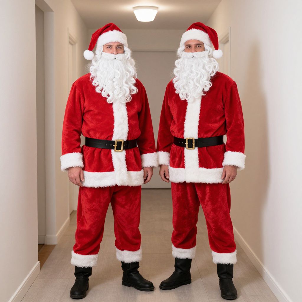 Matching Christmas Clothes Costume, dressed in a santa suit standing in a hallway