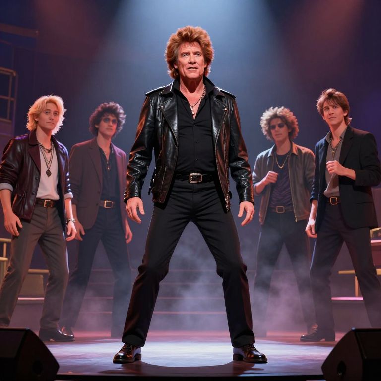 Photograph of a rock band performing on stage. The central male figure with spiky brown hair and a black leather jacket and pants stands confidently with legs apart, hands loose. Surrounding him are four band members with similar hairstyles and outfits: two in black jackets, one in a grey jacket, and one with a white shirt. The background features dim, purple-hued stage lights with a mist effect, and the band members are positioned in a semi-circle. The stage has a dark, polished floor, and the overall mood is energetic and theatrical.