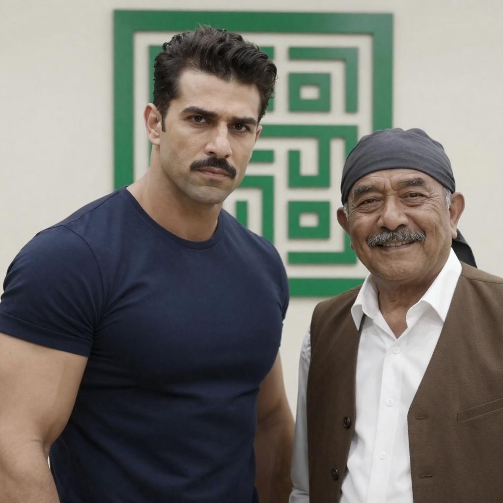 Photograph of two bearded men walking together. Left man with white shirt, sunglasses in pocket, holding cash, muscular, serious expression. Right man in plaid shirt, carrying a bag, black strap across chest, focused expression. Background: pink building, steps, debris. Daylight.