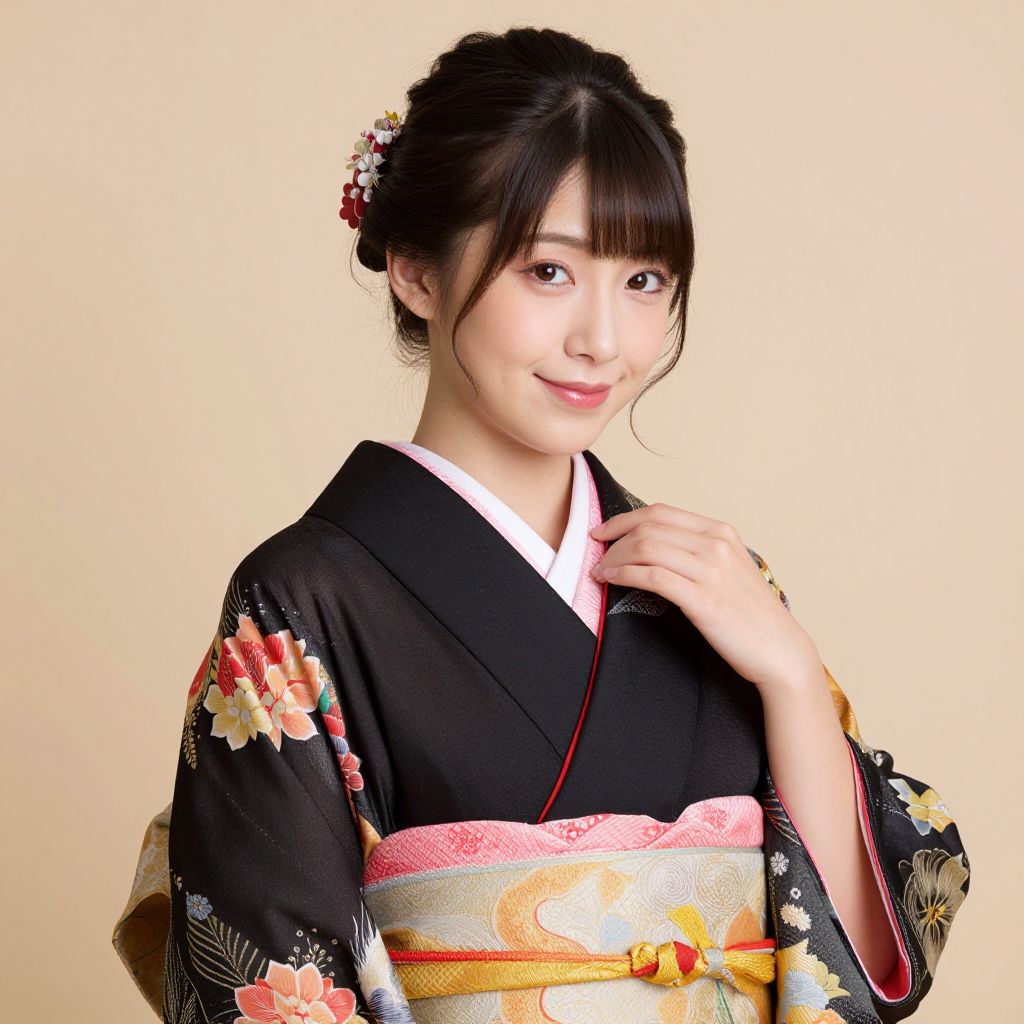 Portrait of a young Asian woman wearing a traditional black kimono with vibrant floral patterns and a pink and gold obi belt. Her hair is styled intricately with floral hairpins, and she has a gentle smile. The photo is taken in a studio with soft-focus lighting, enhancing her natural elegance.