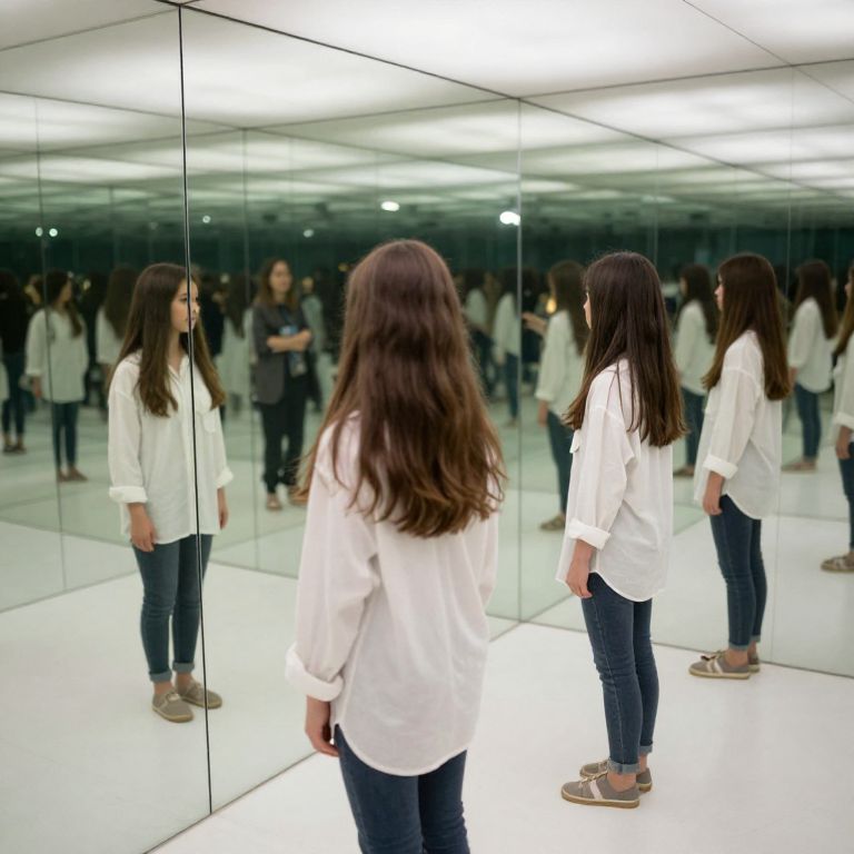 In a prismatic room, the reflections of those who enter age backwards, showing their future selves in mirrors.