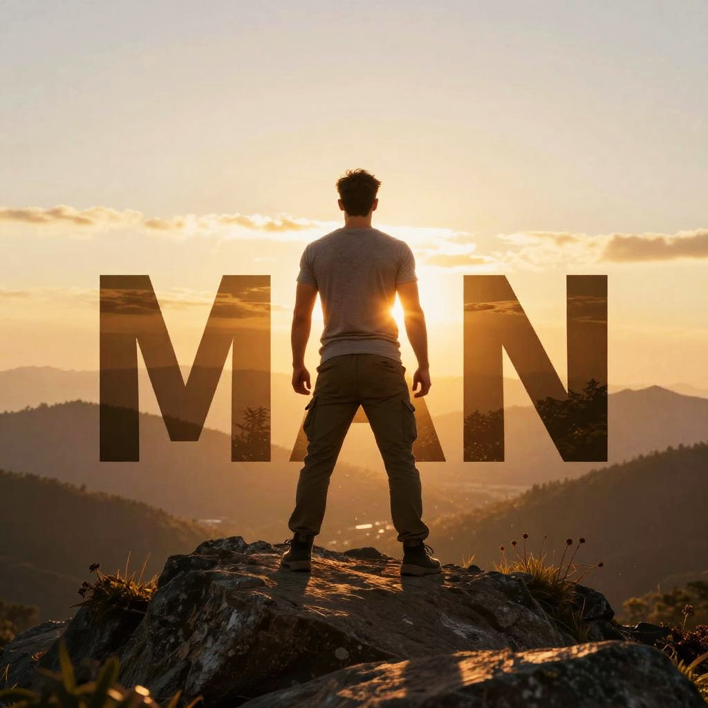 Text to be a man, powerful typography integrated with imagery of a rugged mountain landscape at sunrise, symbolizing strength and growth, warm golden hues, dynamic lighting, cinematic composition, inspirational and motivational atmosphere.