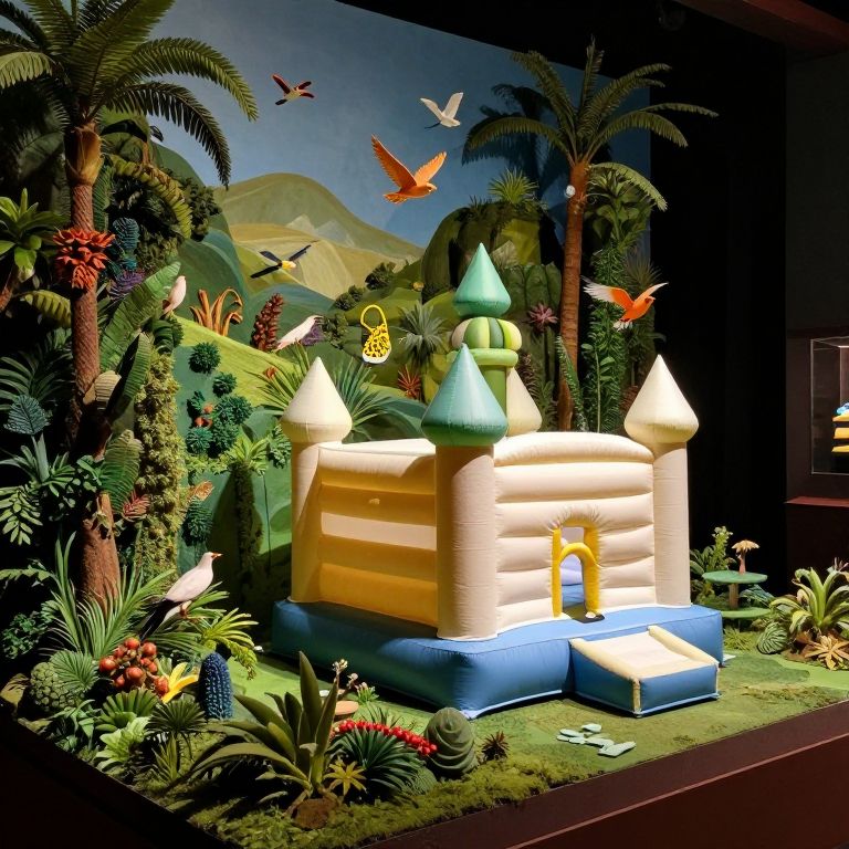 A detailed diorama featuring a fantastical landscape with lush greenery, birds, and an intricate, high-detailed structure resembling a bouncy castle design by Zaha Hadid, set in a theatrical decoration style reminiscent of David LaChapelle's work.