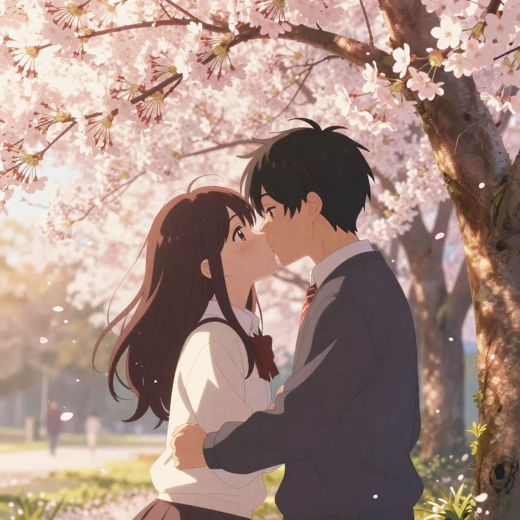 Romantic Anime Kiss Under Cherry Blossoms